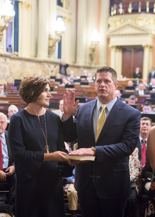 HARRISBURG – Surrounded by wife, Julia, and their two children, Rep. Tim O’Neal (R-Washington) today took the oath of office to represent the people of the 48th District in Washington County. He is committed to working to properly fund addiction treatment, create and protect jobs, improve infrastructure and reform state government.